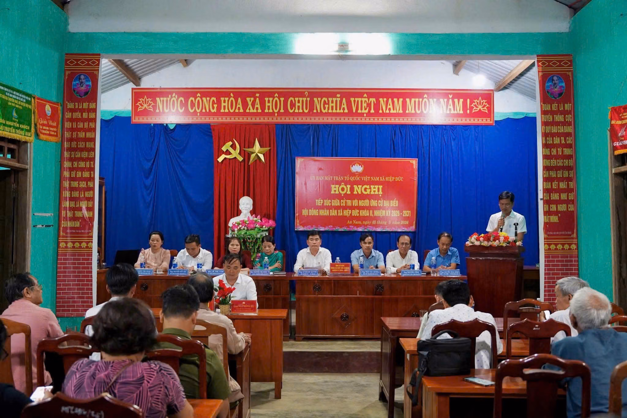 Dưới ánh nắng vàng rực rỡ của những ngày chuẩn bị bước vào sự kiện trọng đại, Hiệp Đức khoác lên mình một tấm áo mới đầy kiêu hãnh. Từ trục đường chính đến các ngõ xóm, đâu đâu cũng rực rỡ sắc đỏ của lá cờ Tổ quốc, sắc vàng của những tấm băng rôn, khẩu hiệu và các pano cổ động cỡ lớn. Hệ thống loa truyền thanh xã đều đặn vang lên những bản nhạc hào hùng xen lẫn thông tin về luật bầu cử, giúp không khí ngày hội thẩm thấu đến từng nếp nhà.